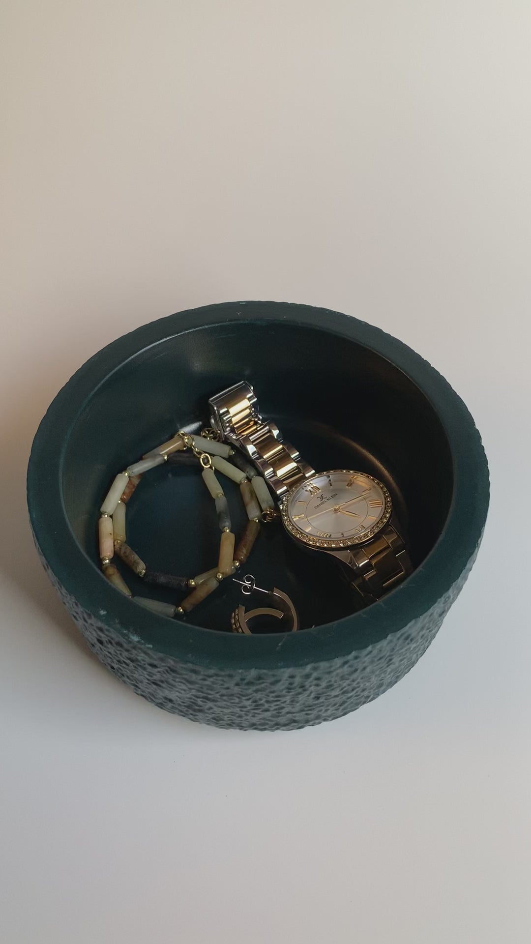 A textured dark turquoise jar, perfect for storing cotton pads, or accessories and keeping them easily accessible. It comes with a lid to protect the contents from dust. The jar is also versatile and can be used to hold pens or makeup brushes.