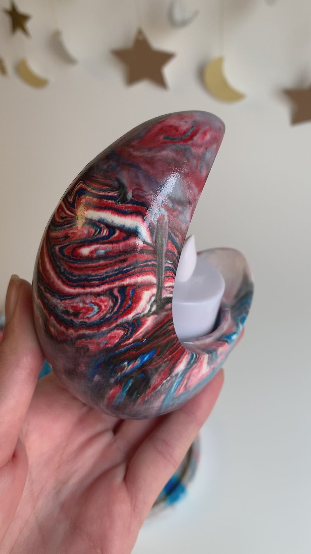 A set a a 3D crescent with an electronic candle and a tray. Ideal for placing your Sebha or small items while creating a warm, and inviting Ramadan glow in your space.
